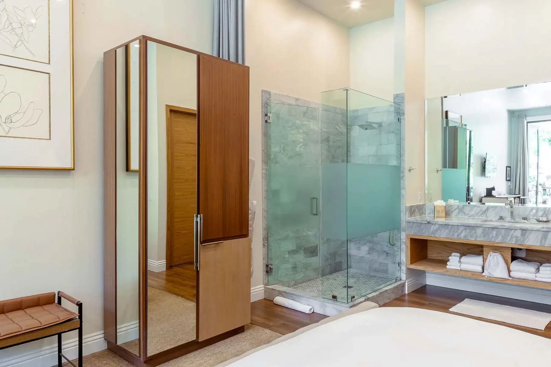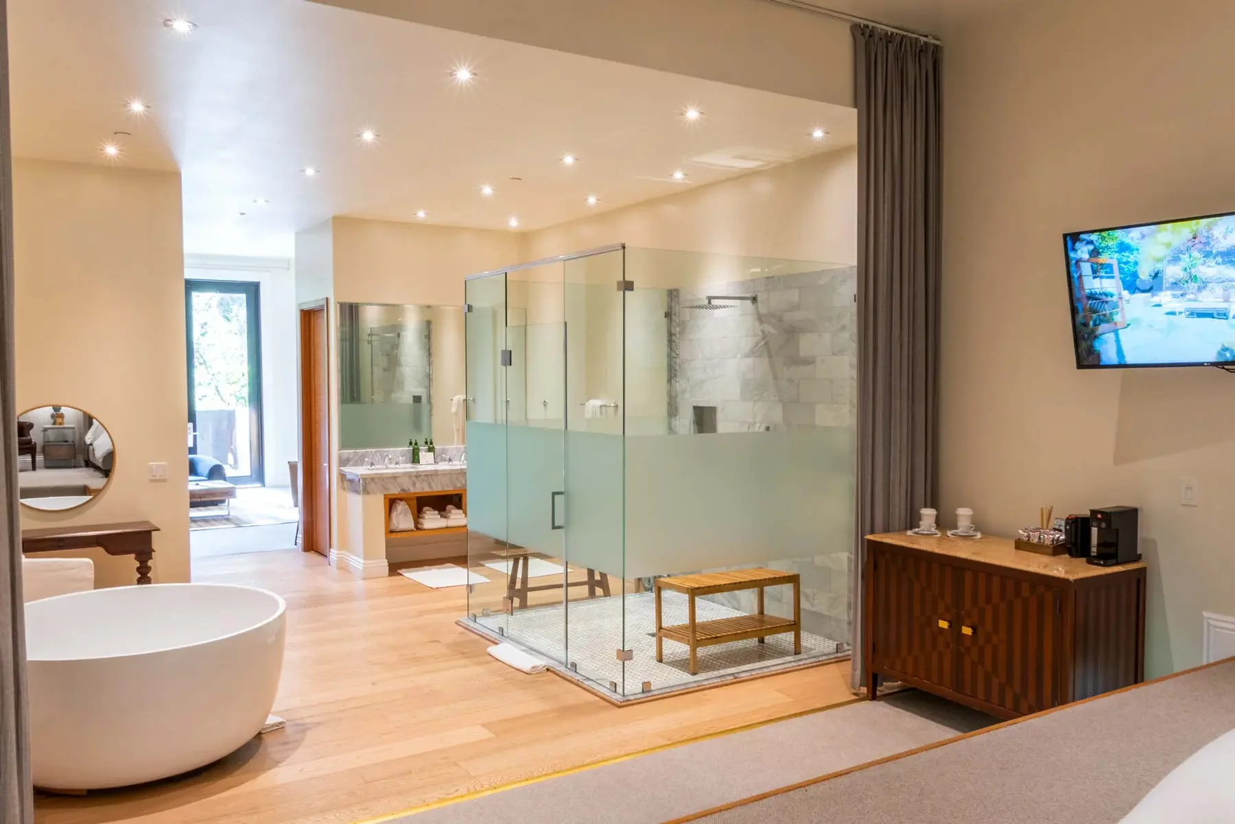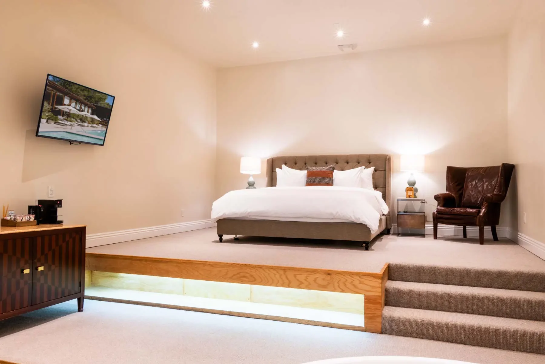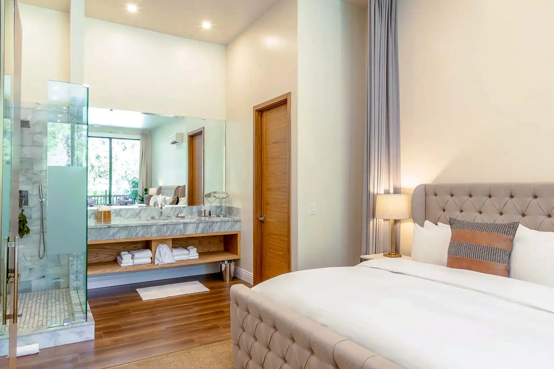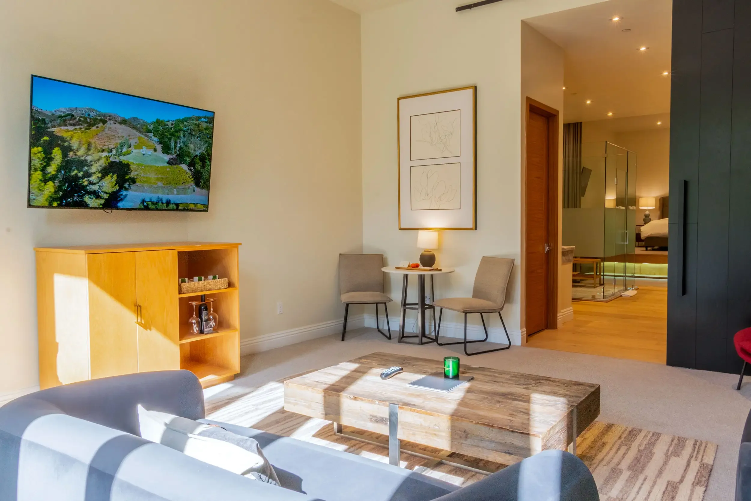 Designed for deeper rest and quiet luxury, the Estate Suite offers a spacious, thoughtfully appointed retreat to unwind between sessions. Featuring a king bed and a separate living area, it creates a sense of openness, comfort, and ease.