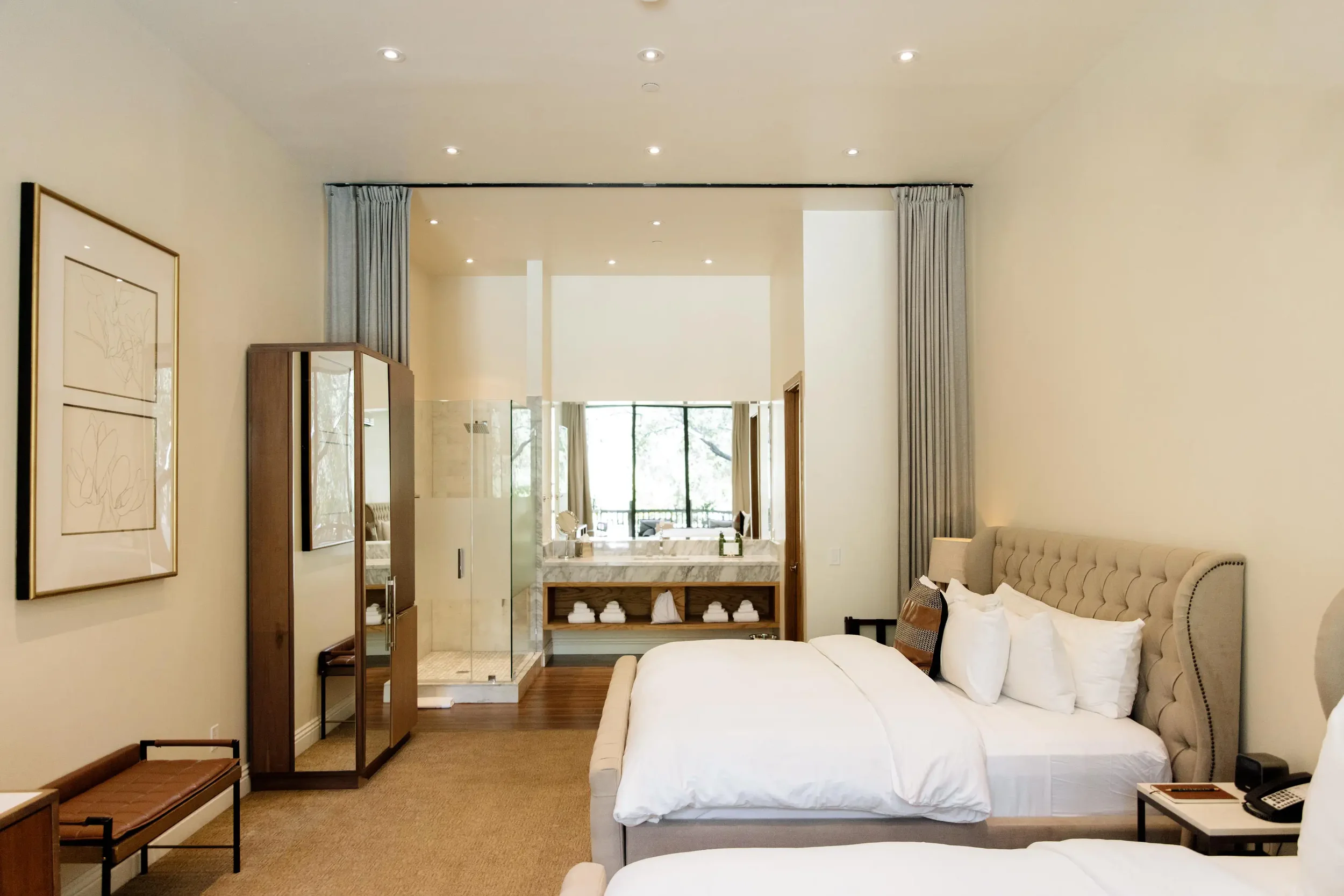 Designed for comfort and ease, the Estate Room provides a restful, beautifully appointed space to recharge throughout the retreat. With two king beds and a serene, understated aesthetic, this room balances shared comfort with privacy and calm.